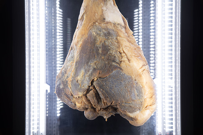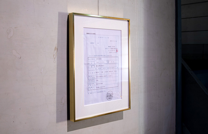Memento Momo / 2023 / installation / video, pork inside fridge, slaughter certificate Exhibition “ART CAMP IN MOMOSHIMA” at ART BASE MOMOSHIMA, Hiroshima