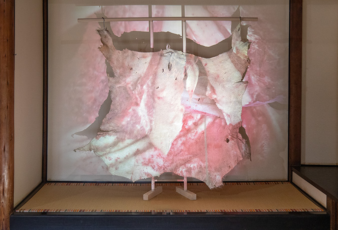 メメント・モモ / 2022年 / インスタレーション / 毛皮に映像をプロジェクション、写真、陶器の貯金箱
